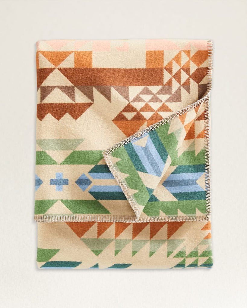 Early travelers to Oregon found a natural spring full of jewel-like stones, which they named Opal Springs. This pattern uses a quilt-like arrangement of shapes to show the movement and beauty of those stones—naturally polished agates—churning in fresh spring water. Expertly loomed, dyed and woven of pure virgin wool in our Pendleton, Oregon, mill, in a double-sided design for two different looks.